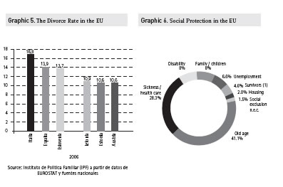 Compared to the 28% of GDP the EU-27 devote to social costs, with major differences among member countries, the family receives only 2.1% of GDP, and this amount has been frozen for 10 years in the EU-15 (graphic 7).
