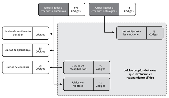 Juicios de recapitulación. Estos juicios dan la oportunidad de proponer dos elementos metacognitivos dentro de los hallazgos del presente estudio, para este dominio específico. Esta es una apuesta que conceptualmente permite la elaboración de dos nuevos juicios en las ciencias de la salud: los juicios de recapitulación y los juicios con hipótesis. Esta posibilidad teórica surge del análisis de lo expresado en entrevistas por los estudiantes de medicina que participaron en la investigación. Las características de los juicios metacognitivos presentes llevan describir las acciones realizadas en la atención y a la formulación de hipótesis sobre la toma de decisiones clínicas.