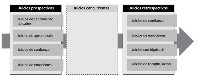 El análisis de los juicios metacognitivos se vincula con creencias epistémicas sobre la fuente, la estructura y la justificación del conocimiento (González y Farré, 2010). Se trata de inferencias conscientes o inconscientes que se constituyen en señales que se derivan de la experiencia y el conocimiento y, a la vez, dependen de la fluidez en recuperación o la familiaridad con una tarea (Siedlecka et al., 2016). De este modo, se ha creado una taxonomía que incluye los juicios prospectivos, concurrentes y retrospectivos y, en ellos, los juicios de sentimiento de saber, juicios de aprendizaje, juicios de confianza, entre otros (Hacker et al., 2009). En esa dirección, los juicios han sido analizados con un enfoque cuantitativo, debido a la imprecisión existente en la metacognición, los sesgos y la necesidad de aproximar el juicio con el aprendizaje real (Metcalfe, 2009; Schraw et al., 2013).