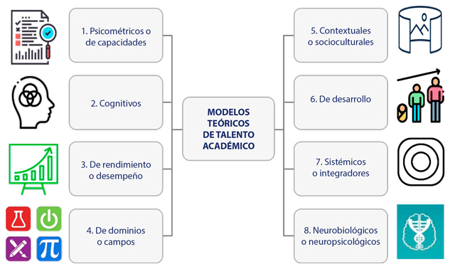 En el marco de esta diversidad terminológica, se han desarrollado diversos modelos teóricos sobre talento que abarcan el dominio académico (Al-Shabatat, 2013; Kaufman y Sternberg, 2008; Quílez-Robres y Lozano-Blasco, 2020; Wolstencroft, 2002), entre ellos: psicométricos (Tourón, 2019; Wasserman, 2020), cognitivos (Monks y Mason, 2000), neurobiológicos (Kruse, 2019), de rendimiento y desempeño (Al-Shabatat, 2013), de dominio específico (Van Tassel-Basca, 2021a), contextuales o socioculturales (Plucker et al., 2021), de desarrollo (Besjes-de Bock y de Ruyter, 2011; Kaufmann y Sternberg, 2008; VanTassel-Baska, 2021b) y sistémicos o integrativos (Callahan et al., 2018a; Dai, 2021; Fisher-Ontrup y Fisher, 2017).