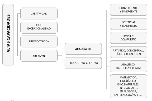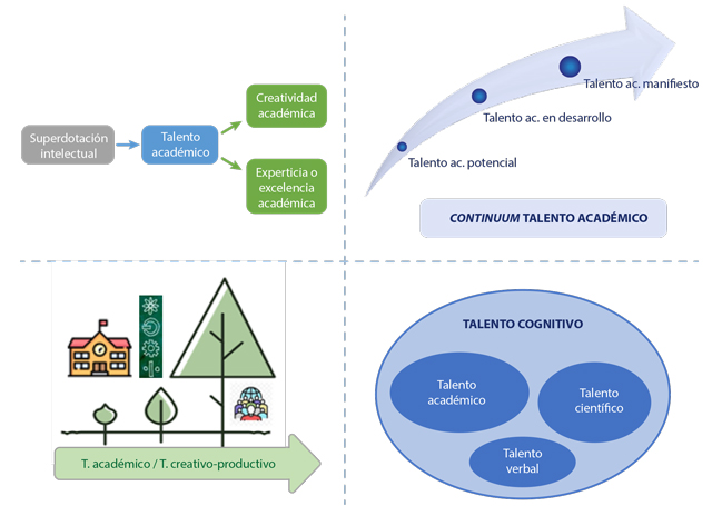 Como marco general, el talento es considerado una excepcionalidad, debido a su baja prevalencia (Barraza-López, 2015; Robinson y Clinkenbeard, 1998), o bien como una alta capacidad (Conejeros y Gómez, 2020; Quílez-Robres y Lozano-Blasco, 2020), por su ubicación en los percentiles superiores. Si se asumen las altas capacidades humanas como manifestaciones diversas de un continuo dinámico o de cierta trayectoria de desarrollo (Castelló y De Battle, 1998; Sastre-Riba, 2019), existen cuatro categorías o manifestaciones neural y temporalmente diferenciables de estas: la superdotación, la creatividad, la doble excepcionalidad y el talento.