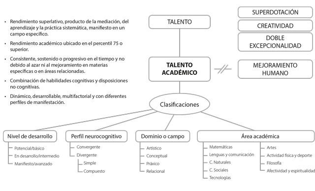 En virtud de esta diversidad de perspectivas y estimaciones, se procede con la conceptualización del talento académico, para lo cual se enuncian categorizaciones del concepto, sus distinciones con respecto a conceptos similares, sus características distintivas y posibles clasificaciones.