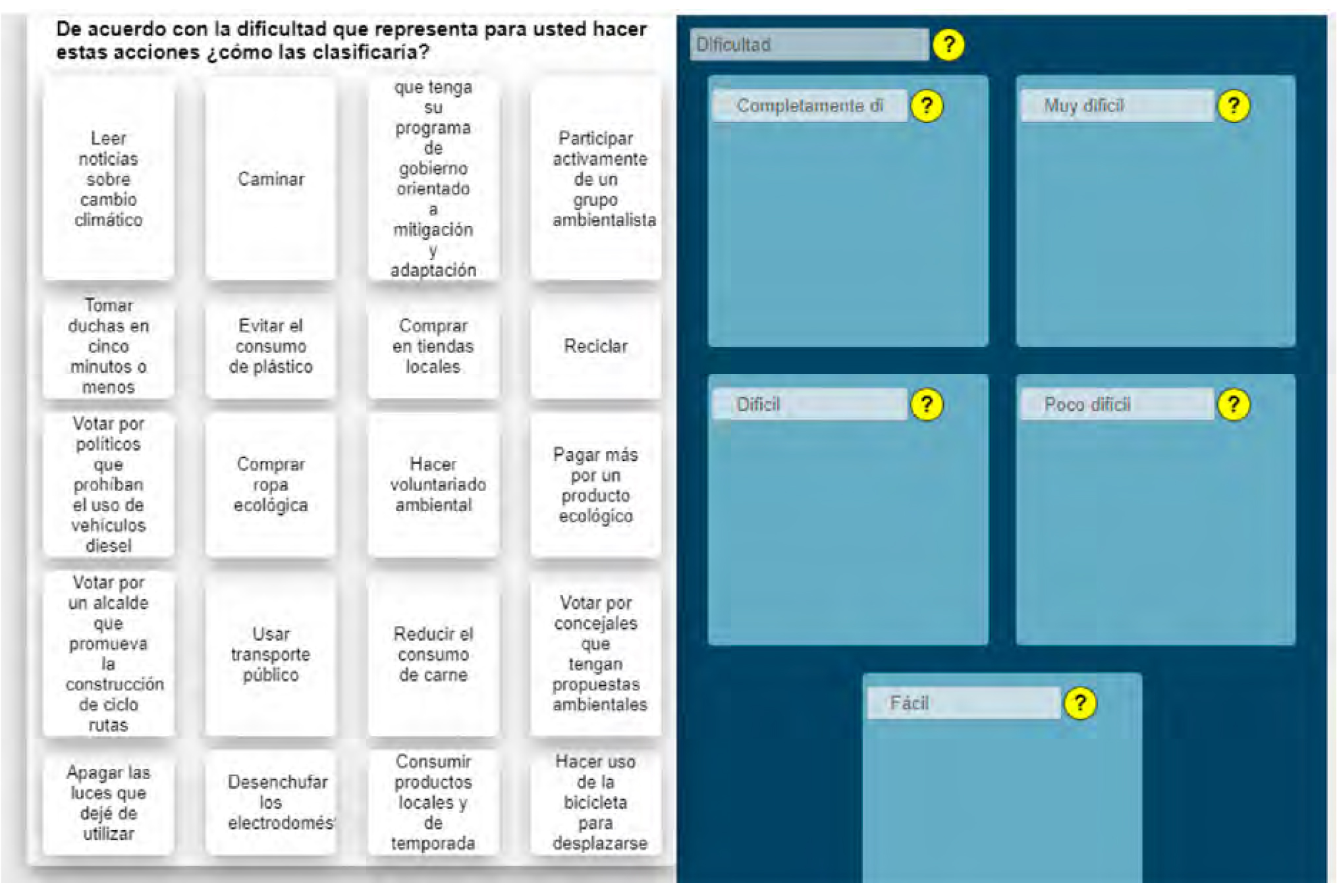 La Figura 1 muestra la captura de pantalla del aplicativo informático que pedía al participante clasificar virtualmente las tarjetas por nivel de dificultad, uno de los pasos del aplicativo para la recolección de información.