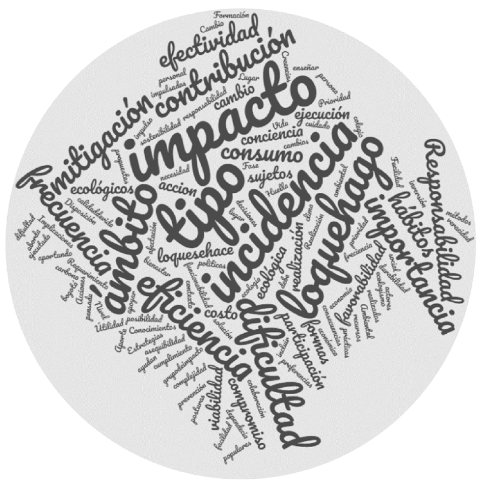 Al construir la nube de palabras (Figura 2) se evidenció que los criterios más utilizados para clasificar las acciones de mitigación dadas fueron: tipo de acción, incidencia, impacto, ámbito, lo que hago, dificultad, eficiencia, mitigación, contribución, efectividad, importancia. La más frecuente fue "tipo de acción", lo que se visualiza en la Figura 2 por su mayor tamaño de letra.