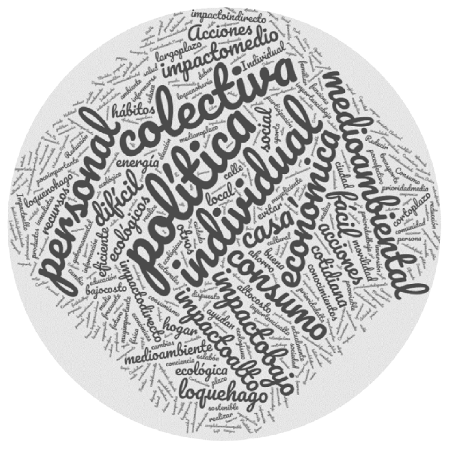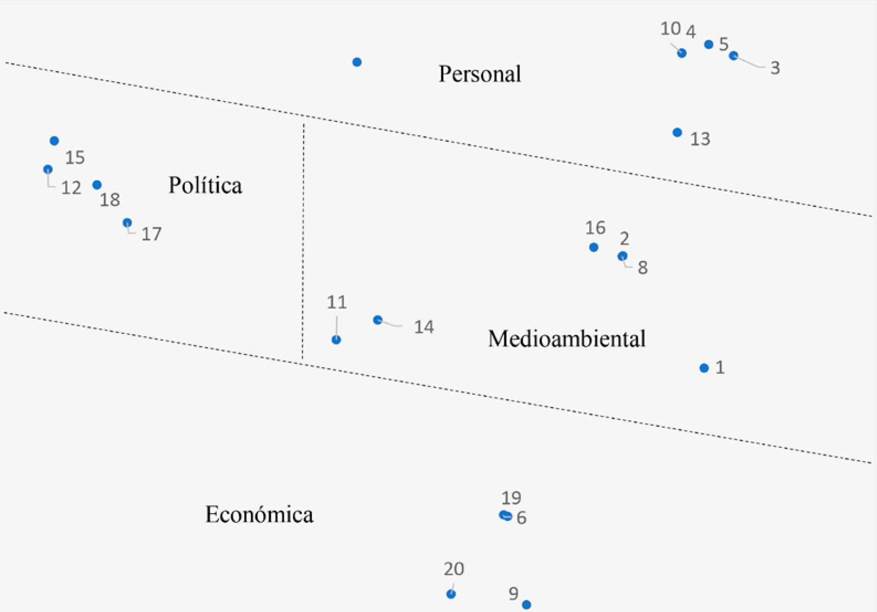 Para nombrar dichas regiones se tuvieron en cuenta las palabras más frecuentes en la nube de palabras de categoría que describieran correctamente las acciones contenidas en cada agrupación. De este modo, la primera agrupación fue denominada "personal", porque recoge las acciones de tipo individual como caminar, reciclar, tomar duchas de cinco minutos o menos, hacer uso de la bicicleta para desplazarse, desenchufar los electrodomésticos y apagar las luces que se deja de utilizar. El siguiente grupo, denominado "política", recoge las acciones de carácter político, es decir las cuatro acciones que tienen que ver con la intención de voto. El tercer grupo al que se denominó "medioambiental" recoge las acciones que quizás para los estudiantes son de tipo ambiental, como leer noticias sobre cambio climático, hacer voluntariado ambiental, participar activamente de un grupo ecológico, evitar el consumo de plástico, usar transporte público y reducir el consumo de carne; y el cuarto grupo, llamado "económico", recoge las acciones de carácter económico, como comprar ropa ecológica, pagar más por un producto ecológico, comprar en tiendas locales, consumir productos locales y de temporada (Figura 4).