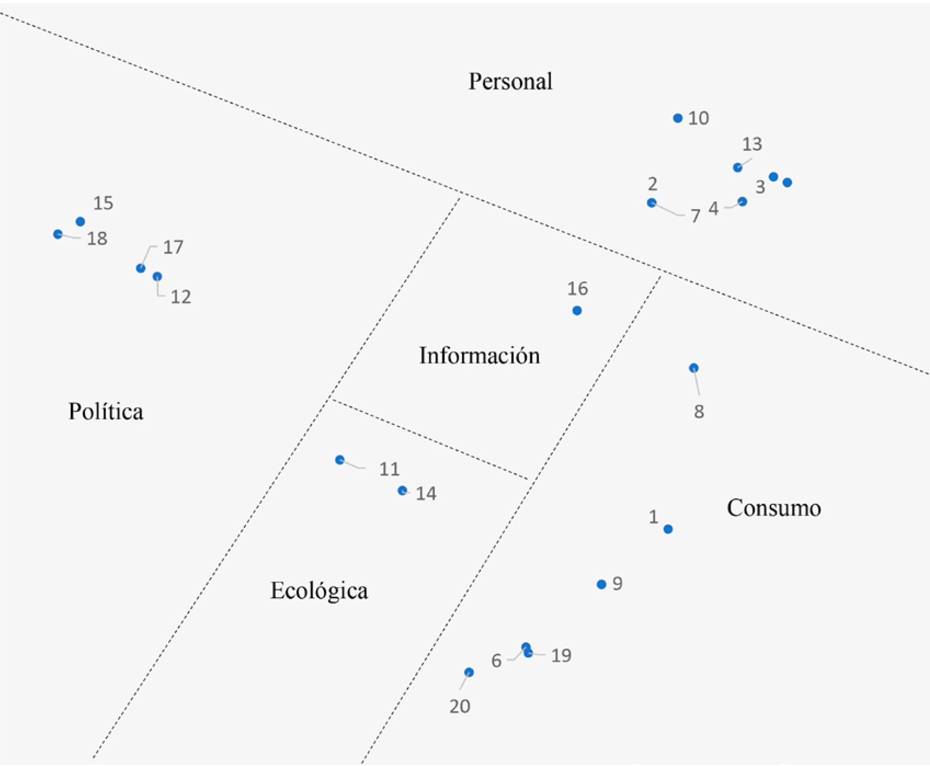 Para profundizar en la estructura conceptual más allá del "tipo de acción", se eliminaron de la matriz base las clasificaciones guiadas por este criterio, lo que dio lugar a una nueva matriz que se llevó de nuevo al análisis MSA, cuya gráfica se observa en la Figura 5. El nuevo gráfico dio lugar a cinco regiones creadas por los investigadores siguiendo los mismos principios de contigüidad y contenido de las acciones contenidas en las tarjetas: la primera región mantiene una agrupación que se denominó "personal", que es igual a la descrita en la Figura 4, pero incluye la tarjeta 2: "Usar transporte público"; la segunda "política" es exactamente igual a la descrita anteriormente, pero se crean tres nuevas regiones: una denominada "Información", en la que aparece una única acción claramente separada: leer noticias sobre cambio climático (tarjeta 16); la otra se llamó "ecológica" e incluye únicamente las dos acciones que tienen que ver con una actividad ambiental propiamente dicha: hacer voluntariado ambiental (tarjeta 14) y participar activamente de un grupo ecológico (tarjeta 11); y una tercera región, que se denominó "consumo", que incluye las acciones que en la Figura 4 estaban como económicas, más las acciones de evitar el consumo de plástico (tarjeta 8) y reducir el consumo de carne (tarjeta 1).