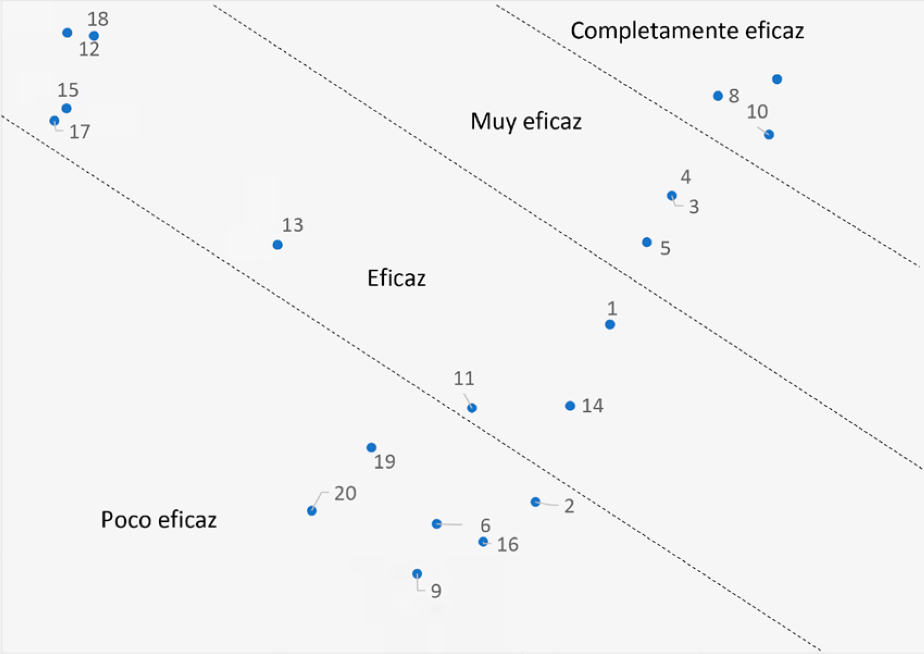 Se realizó un tercer tipo de análisis para los resultados de las clasificaciones de acuerdo con los criterios propuestos por los investigadores de eficacia y dificultad. Para esto se crearon dos matrices: una que recoge las agrupaciones a partir de la escala presentada a los participantes para evaluar cada acción a partir de su eficacia y otra en la que los participantes evalúan las acciones de acuerdo con su dificultad de llevarlas a cabo.