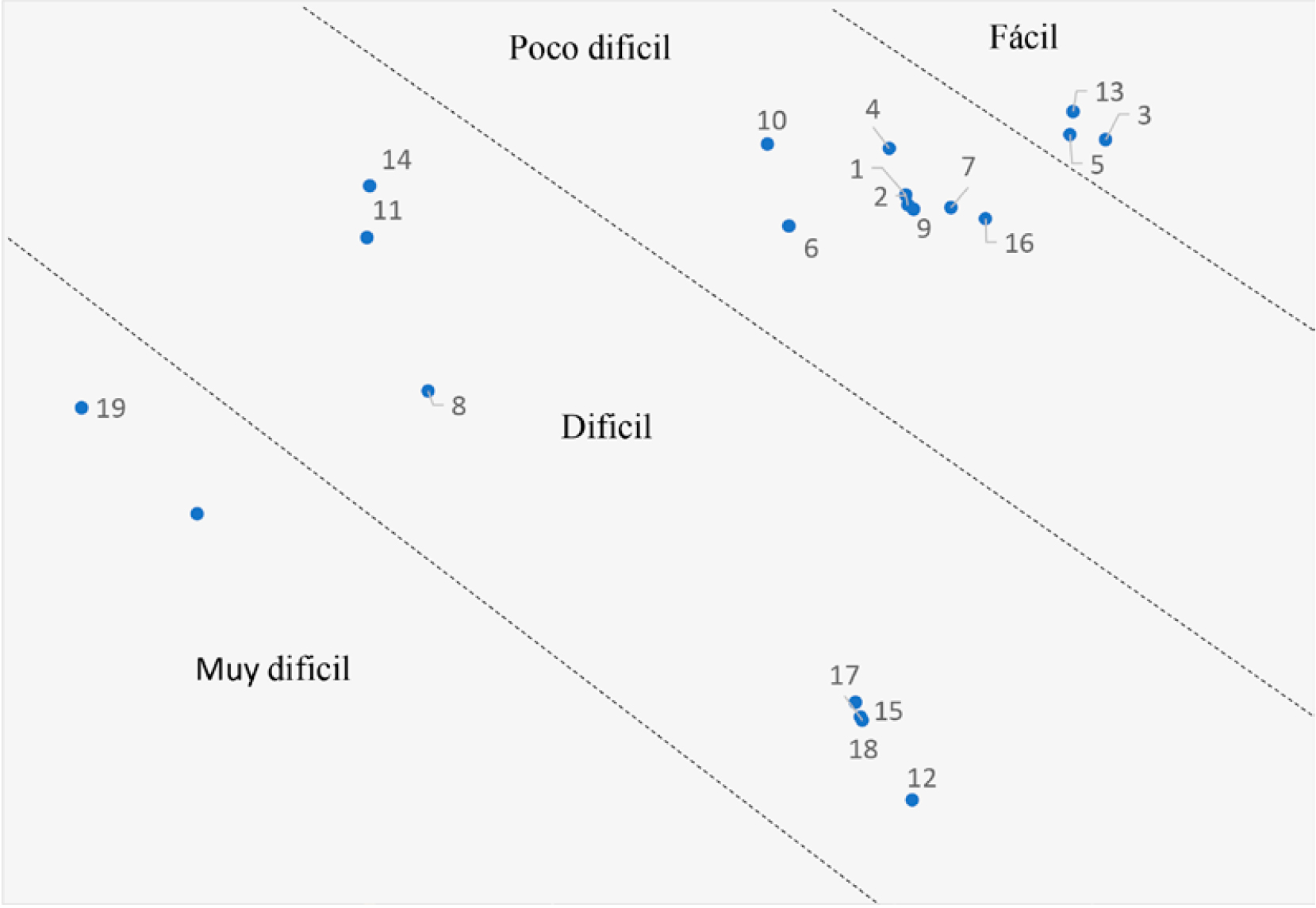 Al explorar los resultados por el nivel de dificultad para llevar a cabo estas acciones, los estudiantes señalaron como acciones muy difíciles: comprar ropa ecológica (tarjeta 19), pagar más por un producto ecológico (tarjeta 20); difíciles: hacer voluntariado ambiental (tarjeta 14), participar activamente en un grupo ecológico (tarjeta 11), evitar el consumo de plástico (tarjeta 8), votar por un político que tenga su programa de gobierno orientado a mitigación y adaptación al cambio climático (tarjeta 18), votar por concejales que tengan propuestas ambientales (tarjeta 12), votar por políticos que prohíban el uso de vehículos diésel (tarjeta 15), votar por un alcalde que promueva la construcción de ciclo rutas (tarjeta 17); poco difícil: consumir productos locales y de temporada (tarjeta 6), usar transporte público (tarjeta 2), tomar duchas de 5 minutos o menos (tarjeta 4), comprar en tiendas locales (tarjeta 9), reducir el consumo de carne (tarjeta 1), hacer uso de la bicicleta para desplazarse (tarjeta 10), reciclar (tarjeta 7), leer noticias de cambio climático (tarjeta 16); fácil: apagar las luces (tarjeta 3), desenchufar los electrodomésticos (tarjeta 5) y caminar (tarjeta 13) (Figura 7).
