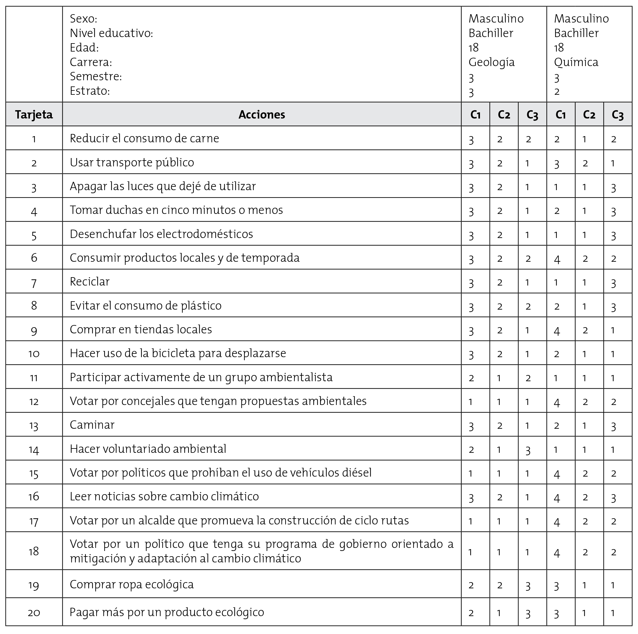 Con base en los resultados de los análisis de "eficacia" (Figura 6), los estudiantes señalaron como acciones completamente eficaces: reciclar (tarjeta 7), evitar el consumo de plástico (tarjeta 8) y hacer uso de la bicicleta para desplazarse (tarjeta 10); muy eficaces: apagar las luces (tarjeta 3), desenchufar los electrodomésticos (tarjeta 5) y tomar duchas de cinco minutos o menos (tarjeta 4); eficaces: votar por un político que tenga su programa de gobierno orientado a mitigación y adaptación al cambio climático (tarjeta 18), votar por concejales que tengan propuestas ambientales (tarjeta 12), votar por políticos que prohíban el uso de vehículos diésel (tarjeta 15), votar por un alcalde que promueva la construcción de ciclorrutas (tarjeta 17), caminar (tarjeta 13), reducir el consumo de carne (tarjeta 1), hacer voluntariado ambiental (tarjeta 14) y participar activamente en un grupo ecológico (tarjeta 11); poco eficaces: comprar ropa ecológica (tarjeta 19), pagar más por un producto ecológico (tarjeta 20), consumir productos locales y de temporada (tarjeta 6), usar transporte público (tarjeta 2), leer noticias de cambio climático (tarjeta 16), comprar en tiendas locales (tarjeta 9).
