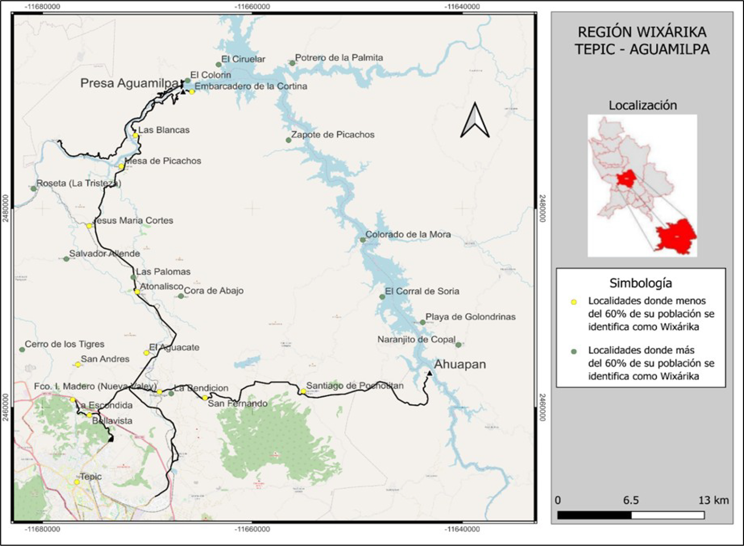 Tomando como criterio básico el porcentaje de población en hogares indígenas por sobre la población total, trece localidades son predominantemente wixaritari: Cerro de los Tigres, Colorado de la Mora, Las Palomas, Playa de Golondrinas, Zapote de Picachos, Cora de Abajo, la Bendición, El Ciruelar, Naranjito de Copal, Salvador Allende, Potrero de la Palmita, el Colorín y la Tristeza. En resumen, se trata de una región intercultural con una preponderante población de adscripción wixárika; además, en localidades con 2.000 habitantes o más (Santiago Pochotitan, Bellavista, Atonalisco y Francisco I. Madero) existen colonias y asentamientos de población wixárika; es el caso de Nueva Valey en Fco. I. Madero.