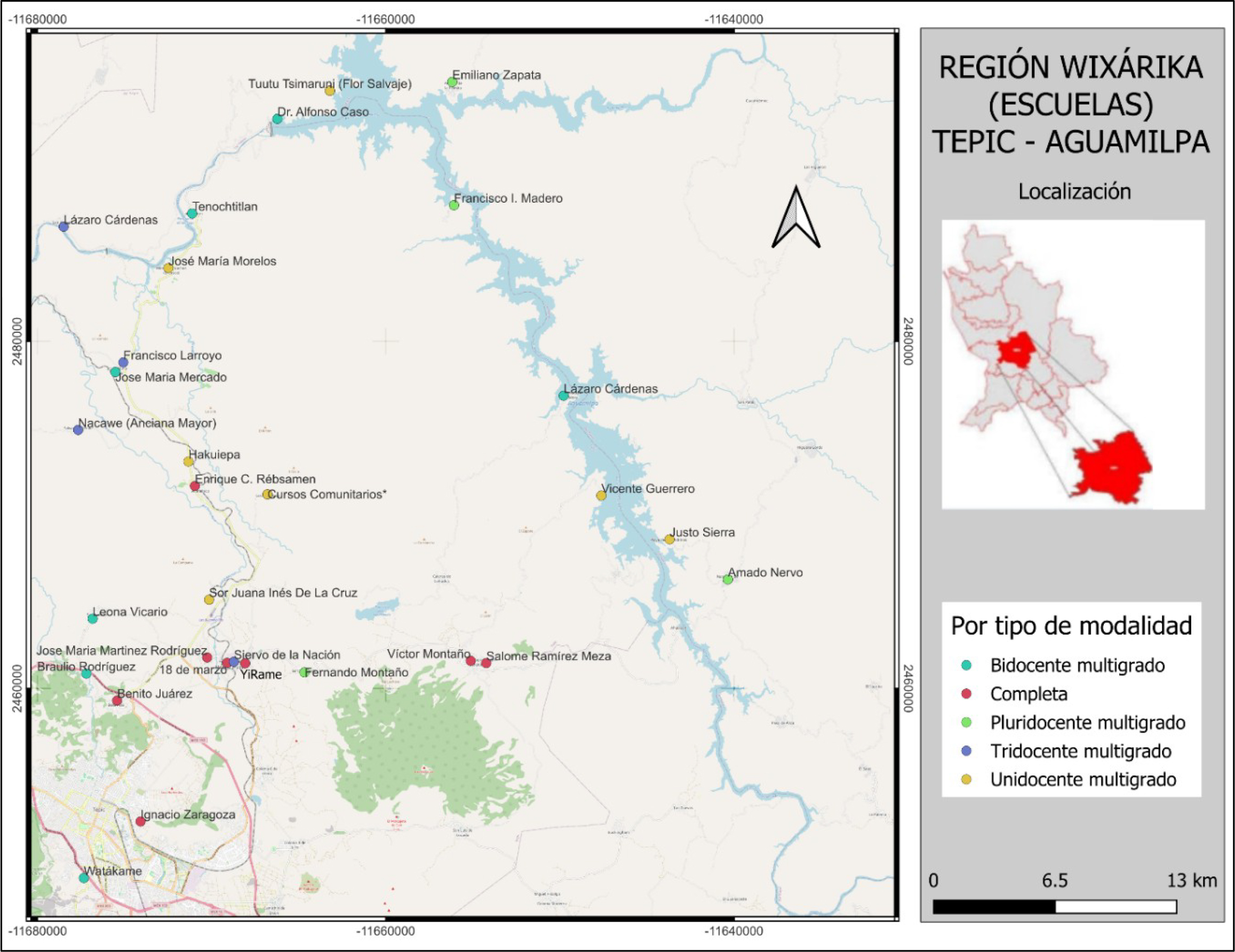 Se levantó un total de 31 formularios de información con datos estadísticos y referenciales de geolocalización de cada una de las escuelas primarias visitadas a lo largo del corredor y en el embalse del río Santiago; cabe señalar que algunas comunidades cuentan además con otras escuelas preescolares, secundarias y bachilleratos, por fuera de este estudio, pero que igualmente tienen profesores y estudiantes hablantes y de autoadscripción wixárika.