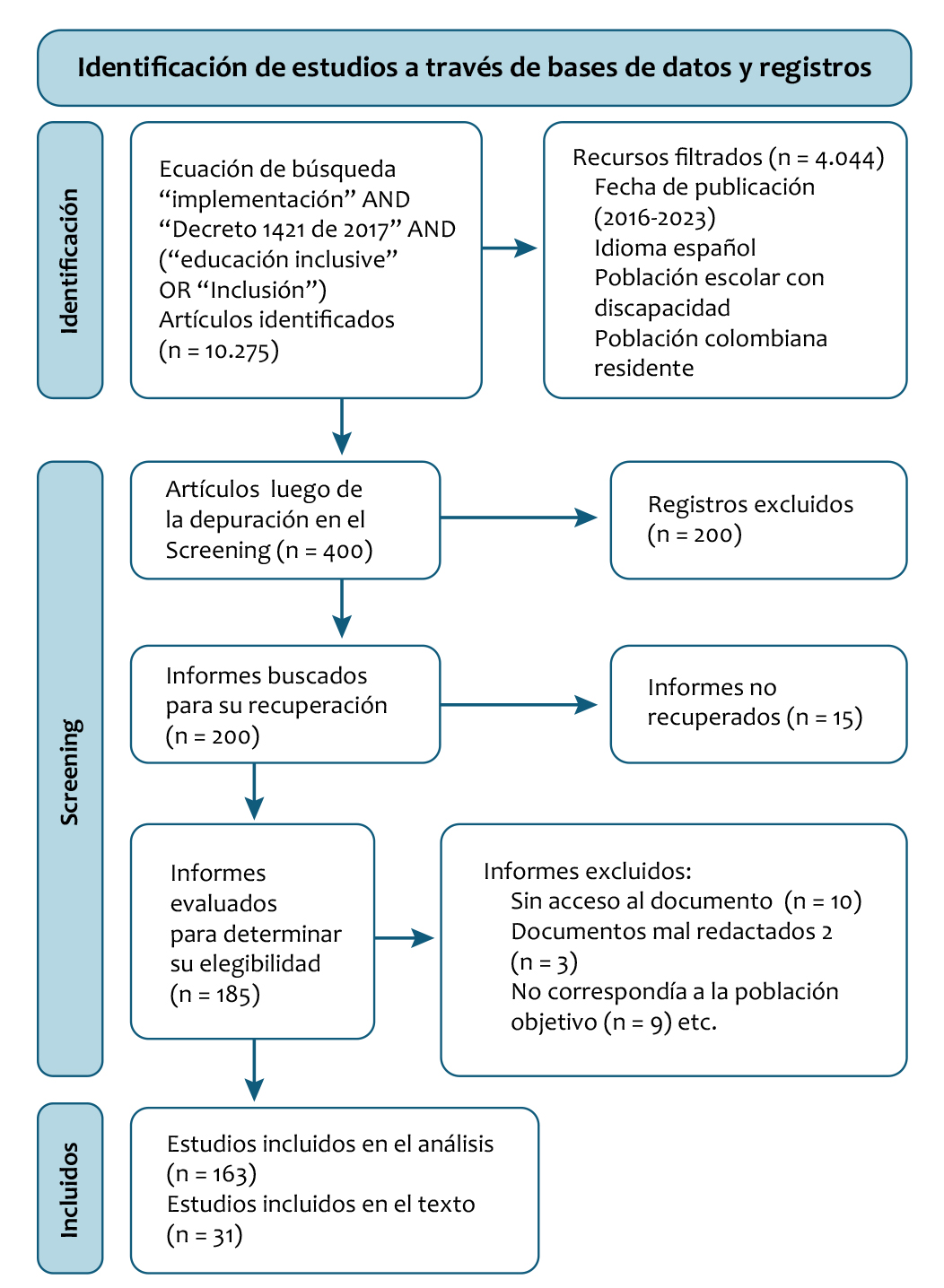 Como se evidencia en la Figura 1, para la revisión de recursos bibliográficos sobre el Decreto 1421, se establecieron como criterios de inclusión que estos reportaran: 1) lineamientos de entidades gubernamentales o territoriales de Colombia (MEN y secretarías de educación departamentales y municipales); 2) experiencias educativas de implementación reportadas de manera lógica y sistemática para evidenciar relaciones entre procesos y resultados; 3) ejecución de planes o proyectos concretos en el sector educativo por parte de instituciones tanto públicas como privadas.