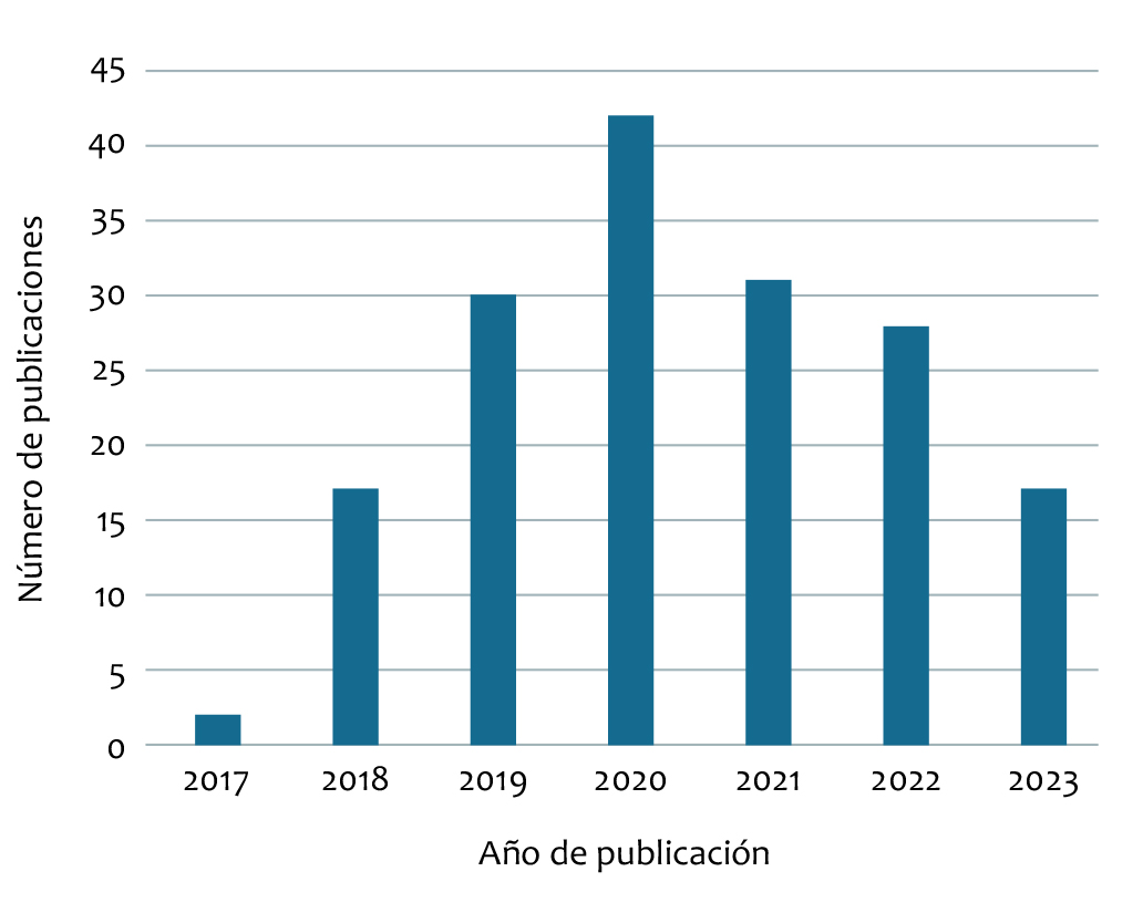 Se identificó un total de 163 recursos que cumplían con los criterios de inclusión en la revisión. Como se muestra en la Figura 2, el año con más publicaciones fue 2020 (25%), seguido de 2021 y 2019 (19% y 18%, respectivamente). Aun cuando se incluyó como filtro el año 2016, por si alguna publicación se centraba en las necesidades del sistema educativo para preparar la reglamentación del Decreto 1421 de 2017, no se encontraron productos relacionados antes de su promulgación. Así mismo, es posible observar que el flujo de publicaciones ha ido decayendo con el paso de los años, por lo que en 2023 solo se registró el 10% de todos los recursos identificados por el estudio.