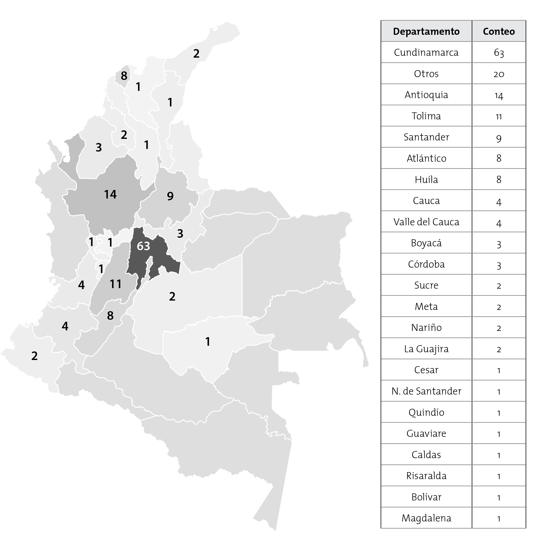 En cuanto a la distribución geográfica de los recursos analizados, Cundinamarca fue el departamento con mayor cantidad de publicaciones (62), aportando el 30,6% de los resultados, en especial por la contribución de Bogotá DC (ver Figura 3). Le siguen Antioquia con el 8,6% y Tolima con 6,7% de los recursos identificados. En cuanto a ciudades, aparte de Bogotá, se identificaron Baranoa (Atlántico), Ibagué (Tolima), Bucaramanga (Santander), Cereté (Córdoba), Soacha, Girardot, Zipaquirá y Chía (Cundinamarca).