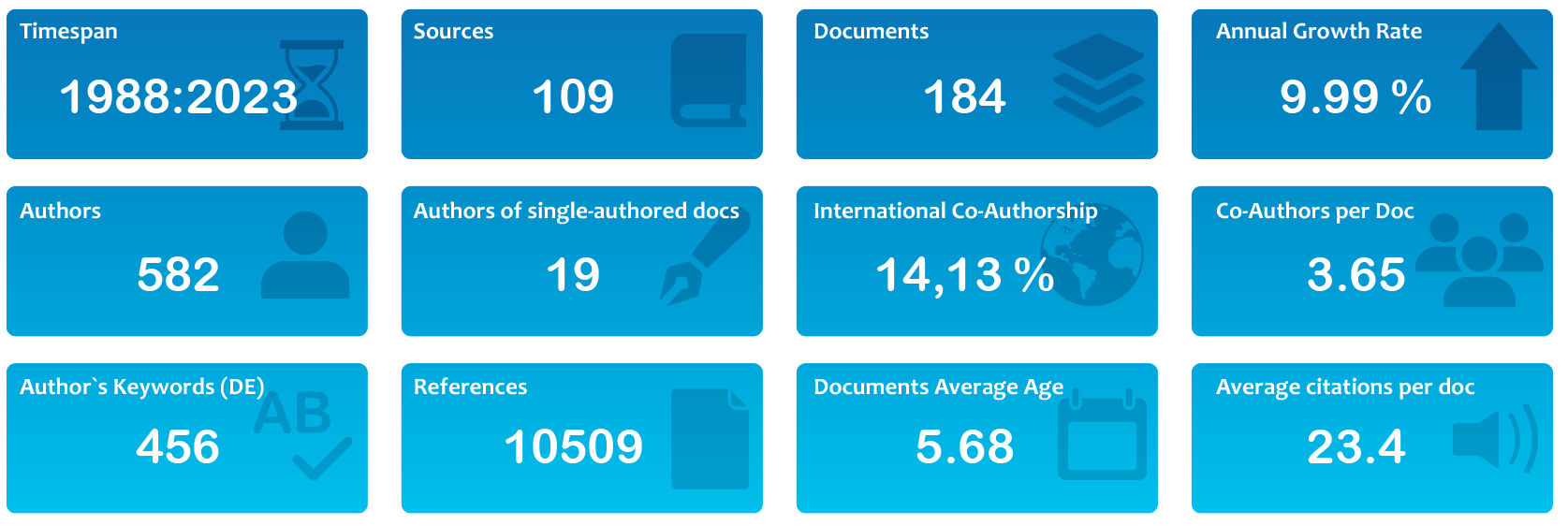 La Figura 1 refleja una exploración exhaustiva de la literatura científica relacionada con las competencias socioemocionales y la inteligencia emocional en el ámbito de la educación inicial y abarca desde el preescolar hasta los primeros años de la educación infantil. La temporalidad del estudio se extiende desde 1988 hasta 2023, con una muestra de 184 documentos extraídos de 109 fuentes distintas. La autoría se distribuye entre 582 investigadores, de los cuales 19 han contribuido con obras unipersonales, evidencia de diversidad en la colaboración que se refleja también en el 14,13% de coautoría internacional.