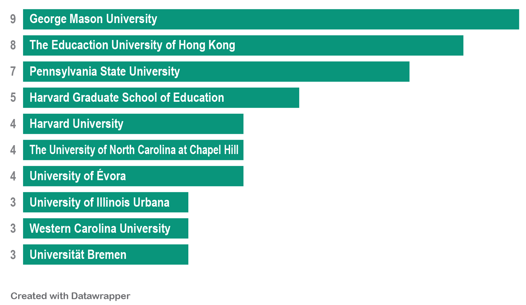 La Figura 5 muestra que instituciones como George Mason University y The Education University of Hong Kong están a la vanguardia en términos de contribuciones. Esto podría indicar áreas geográficas de investigación intensiva y potencial para colaboraciones futuras.