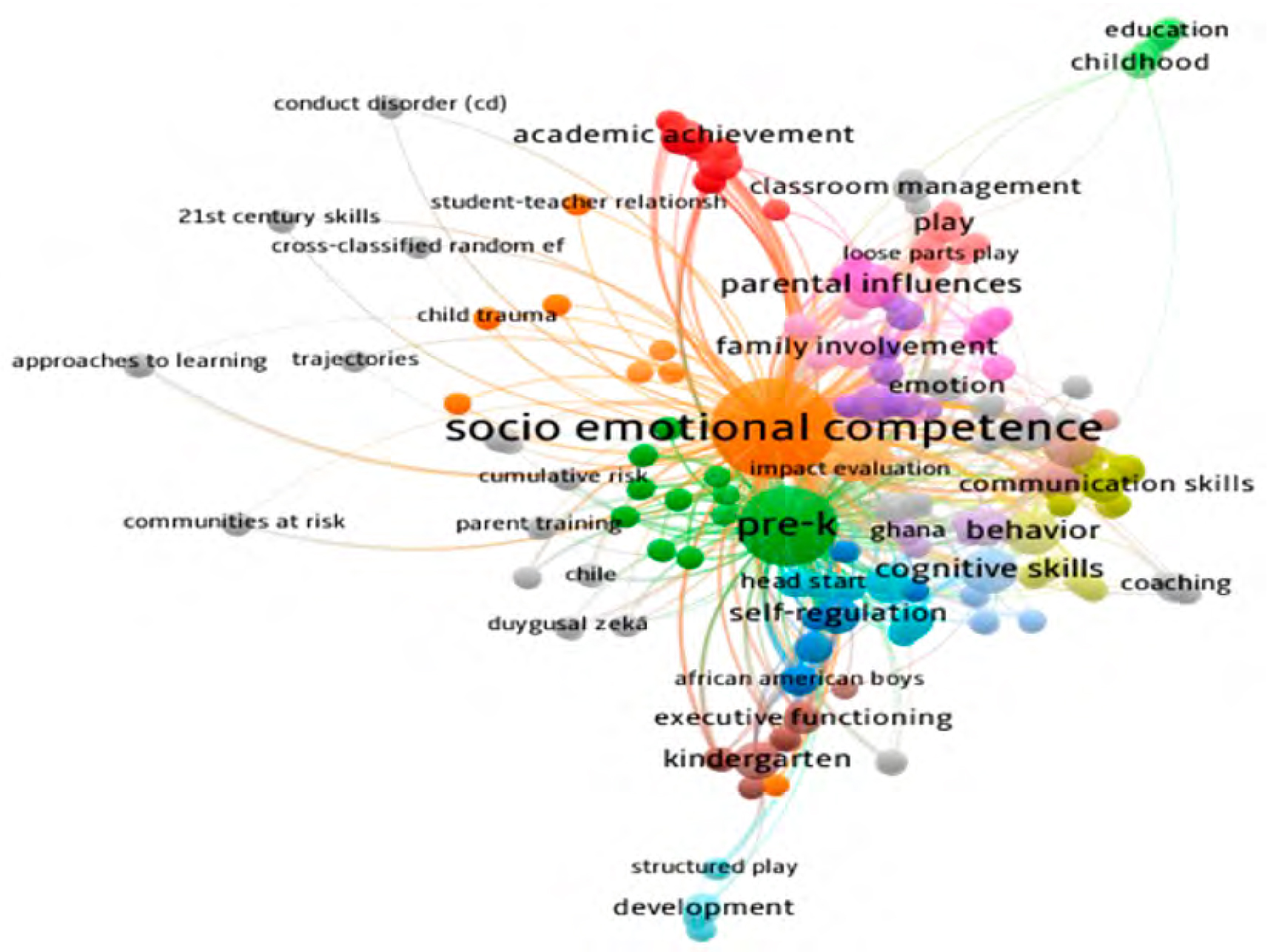 Este mapa semántico ofrece una representación gráfica de la estructura conceptual y el dinamismo del campo de la competencia socioemocional en la educación temprana. Permite identificar rápidamente los núcleos temáticos de la investigación existente y las posibles direcciones para futuros estudios, lo que facilita la navegación por el extenso terreno de la literatura relacionada. Los diferentes colores en el mapa denotan agrupaciones temáticas distintas, que a su vez sugieren subdominios dentro del campo más amplio del desarrollo socioemocional y la educación temprana. Los términos que están más cerca unos de otros, como emotional competence y cognitive skills, se lo discute juntos en la literatura, lo que implica una relación conceptual estrecha. Esto puede indicar una línea de investigación que integra aspectos cognitivos y emocionales en la comprensión del desarrollo infantil.