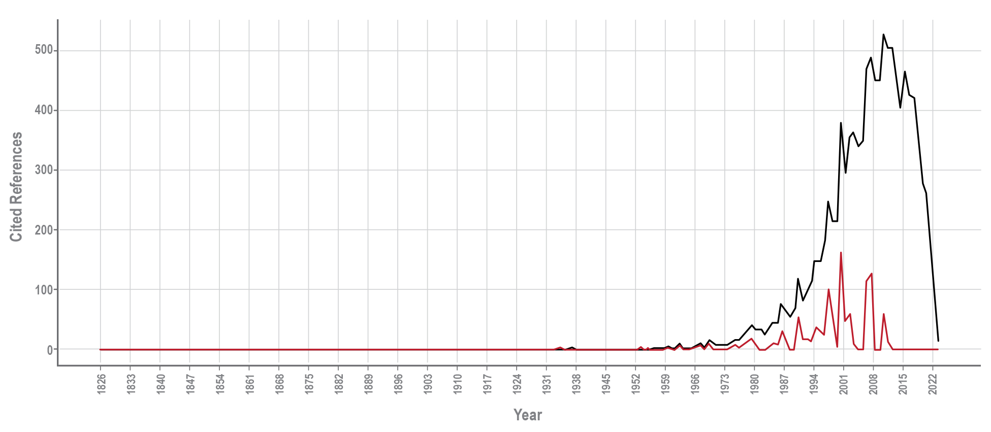 La espectroscopia revela un perfil temporal de las citas que permite visualizar la evolución del impacto académico de los trabajos en este campo. Desde principios del siglo XX hasta aproximadamente el año 2000, observamos que el número de referencias citadas es relativamente bajo y constante, lo que indica que la investigación en competencias socioemocionales en la educación temprana no tenía un cuerpo significativo de literatura influyente o que el campo era menos reconocido. Sin embargo, a partir de los primeros años del siglo XXI hay un notable aumento en las citas, lo que señala un creciente interés y un desarrollo acelerado en esta área de estudio. Este periodo puede corresponder a un crecimiento de la importancia del desarrollo socioemocional en la educación temprana y podría estar asociado con la publicación de estudios pioneros o cambios en las políticas educativas que enfatizan estas competencias.