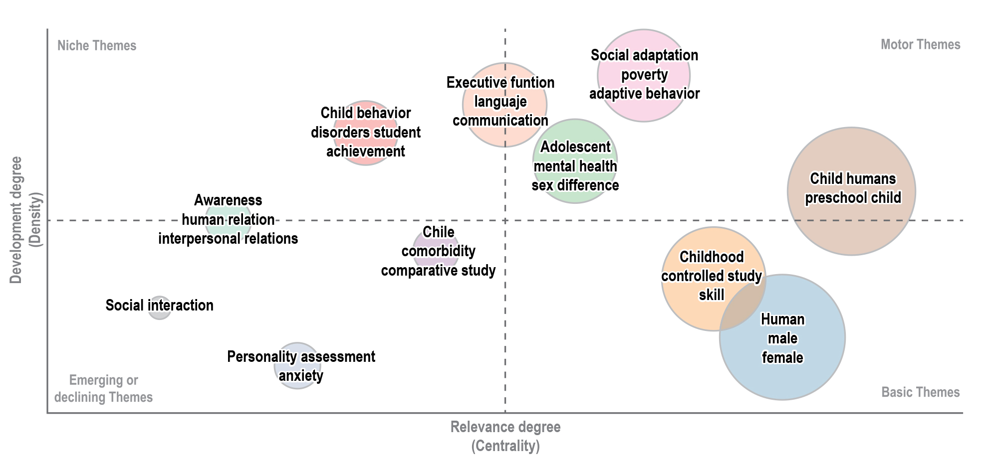 En el eje horizontal, encontramos la relevancia o centralidad de un tema, que indica la frecuencia con la que un concepto aparece y se relaciona con otros conceptos dentro de la red de literatura; es decir, cuán central es un tema en el discurso del campo. En el eje vertical, la densidad de desarrollo representa la cohesión interna y la madurez de la investigación en torno a un tema, lo que sugiere cuánto se ha desarrollado y consolidado un tema en la literatura. Observando el cuadrante inferior derecho, los temas con alta centralidad, pero baja densidad, son considerados temas básicos. Siendo conceptos que son ampliamente discutidos y sirven como piedras angulares en la investigación del campo, encontramos términos como human, preschool child, skill, male y female, lo que indica que hay un reconocimiento general de la importancia de las competencias socioe-mocionales en la educación temprana, con atención a las diferencias de género y habilidades en el desarrollo infantil.