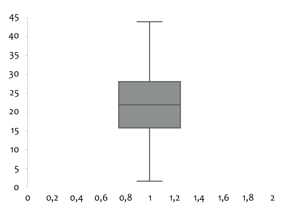 La intensidad de uso educativo de inteligencia artificial (rango 1 a 44) se ubica en un promedio de x = 22,563 y con una desviación típica (n-1) = 8,51. La Figura 1 muestra un diagrama de caja o boxplot con estos datos.