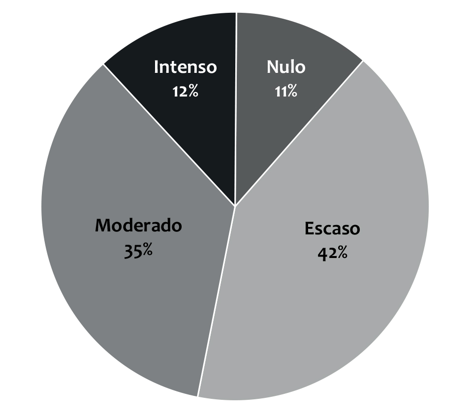 El análisis de los valores que adquiere la muestra al analizar la intensidad de uso educativo de inteligencia artificial, por tramos, se observa en la Figura 2, donde la distribución de las frecuencias relativas muestra que porcentualmente priman las categorías de escaso y moderado uso. La categoría Moda fue de uso escaso, presente en 212 estudiantes (42%).