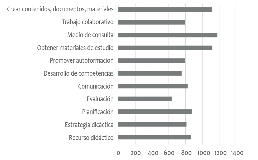 Los ítems presentan valores de x = 889,5 y desviación típica (n-1) = 173,2. Los que adquieren mayor puntaje son: medio de consulta para temas particulares (1.182), obtención de materiales de estudio (1.121) y creación de contenidos, documentos y materiales (1.115). Los puntajes de menor uso fueron para la evaluación (638) y para el desarrollo de competencias (755).