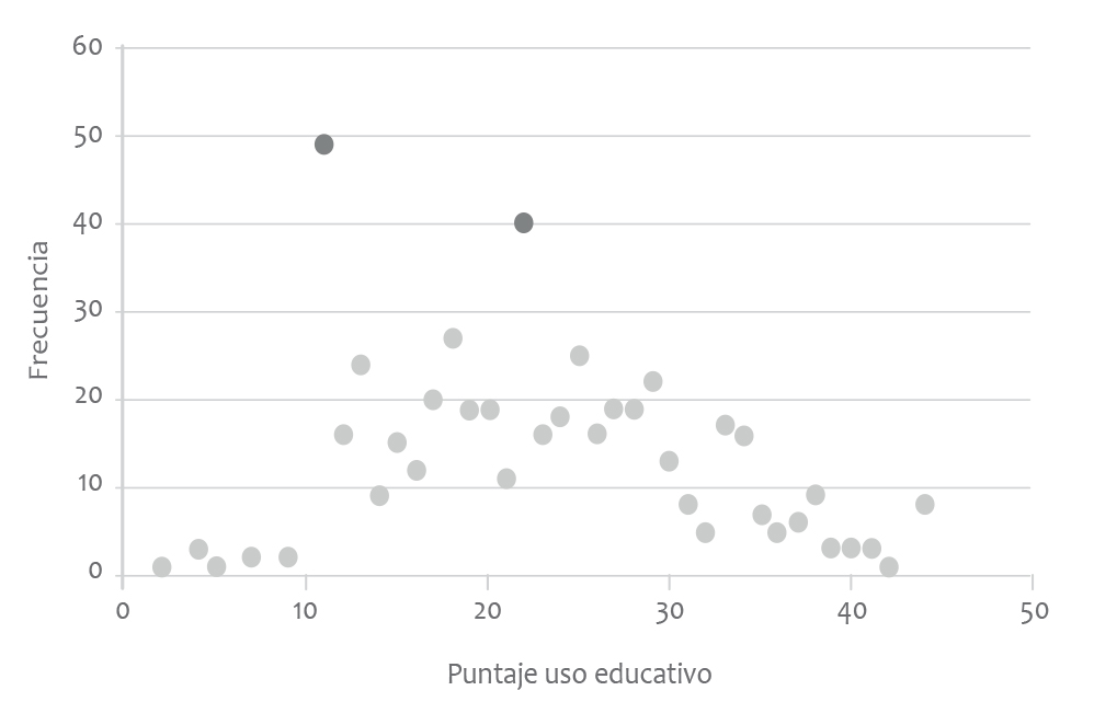 En la Figura 4 puede observarse la distribución de las frecuencias absolutas de los puntajes obtenidos para la muestra, para la variable uso educativo. Se descarta una distribución normal, dado que la prueba de Shapiro-Wilks arroja un valor de W = 0,97 (p < 0,0001). Se identifican dos valores atípicos, ubicados en 11 y 22. Esto significa que una cantidad atípica de estudiantes obtuvieron esos totales. Analizados uno a uno, se encontró que todos los casos con puntaje para uso educativo 11 (n = 49) corresponde a quienes respondieron a todos los ítems con el valor 1 (no uso). Los casos con puntaje 22 (n = 40), sin embargo, no corresponde a respuestas homogéneas a cada ítem (esto es: respuesta 2 -uso esporádico- para los 11 ítems), sino que se respondió de forma diversa.