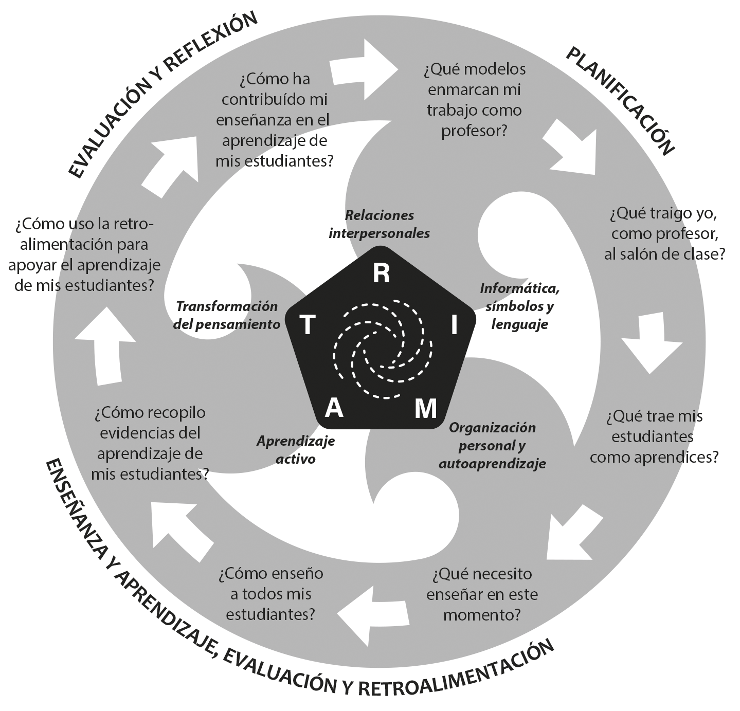 El marco de enseñanza responsiva (MER) (Responsive Teaching Framework - RTF) (Graham et al., 2015) combina las capacidades ATRIO que sustentan el aprendizaje para todos y el aprendizaje perdurable, en un ciclo de enseñanza que puede servir de andamiaje a la práctica docente en las aulas del siglo XXI. La figura 3 evidencia las ocho preguntas del MER durante los tres ciclos.