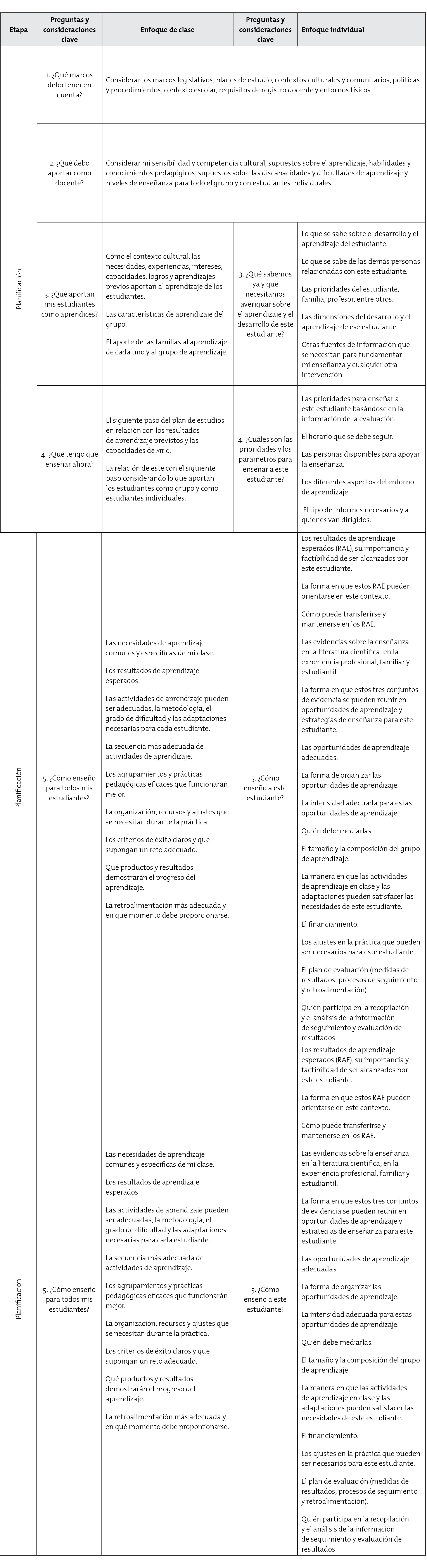 Los procesos complementarios que articulan las respuestas del docente y los profesionales afines se muestran en las dos columnas de la Tabla 1, que reflejan tanto el enfoque en la clase como el enfoque individual. Estos procesos se desarrollan en paralelo con mayor detalle en la Tabla 2, a través de ocho pares de preguntas que atraviesan las mismas fases de planificación, intervención y evaluación, pero las fases pertinentes se enmarcan de forma diferente para tener en cuenta las distintas perspectivas. Es preciso entenderlos como complementarios, con límites flexibles, para satisfacer mejor las metas de aprendizaje.