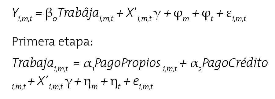 Estas variables instrumentales demostraron ser exógenas debido a que los métodos de pago no tienen un impacto directo sobre los puntajes obtenidos por los estudiantes. Estos instrumentos solo pueden explicar un efecto sobre el rendimiento a través de la variable trabajo. Además, son relevantes porque sí tienen un efecto significativo en la posibilidad de que los alumnos deban trabajar. Por ejemplo, cuando los estudiantes utilizan sus propios recursos o un crédito educativo, su probabilidad de trabajar aumenta. La relevancia para cada instrumento fue confirmada por las pruebas de significancia estadística.
