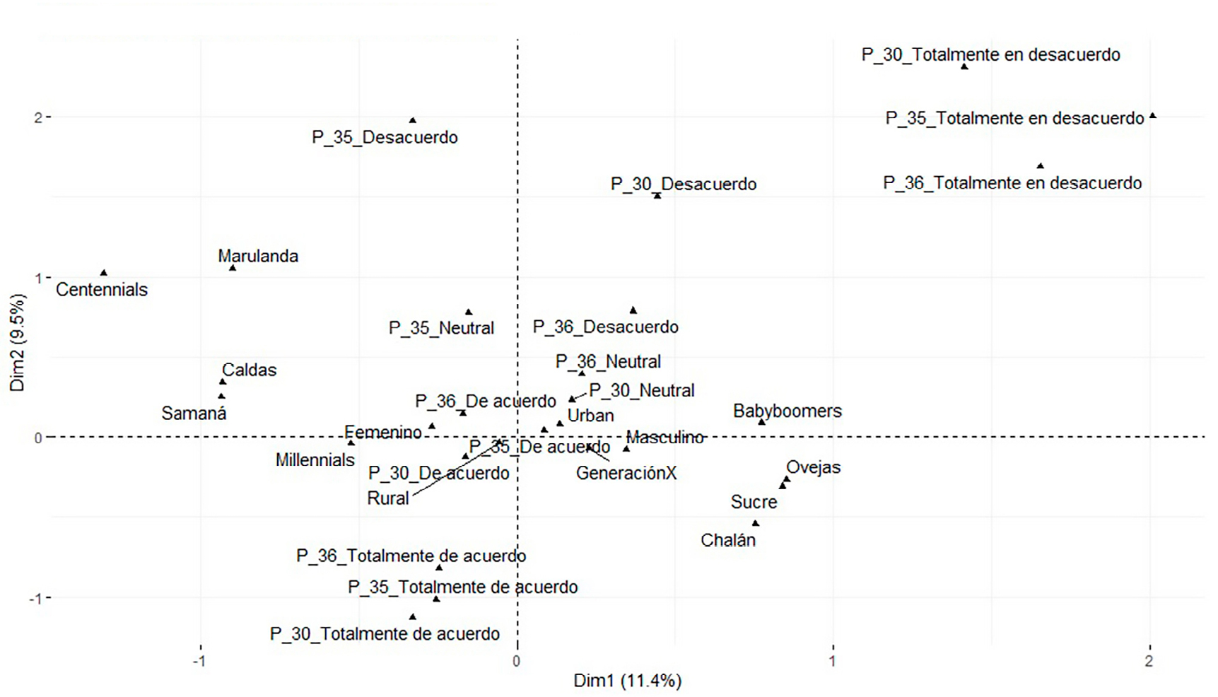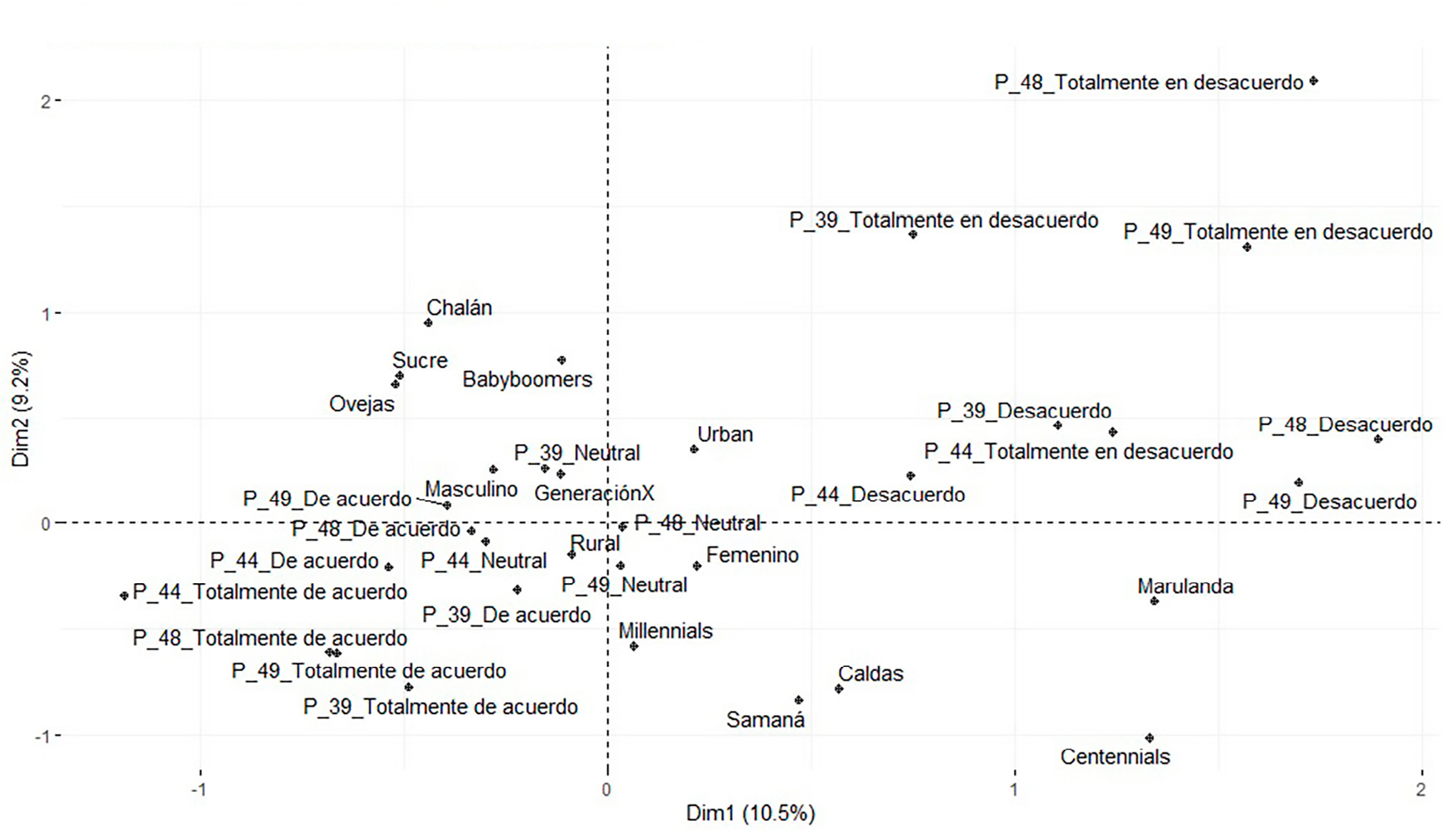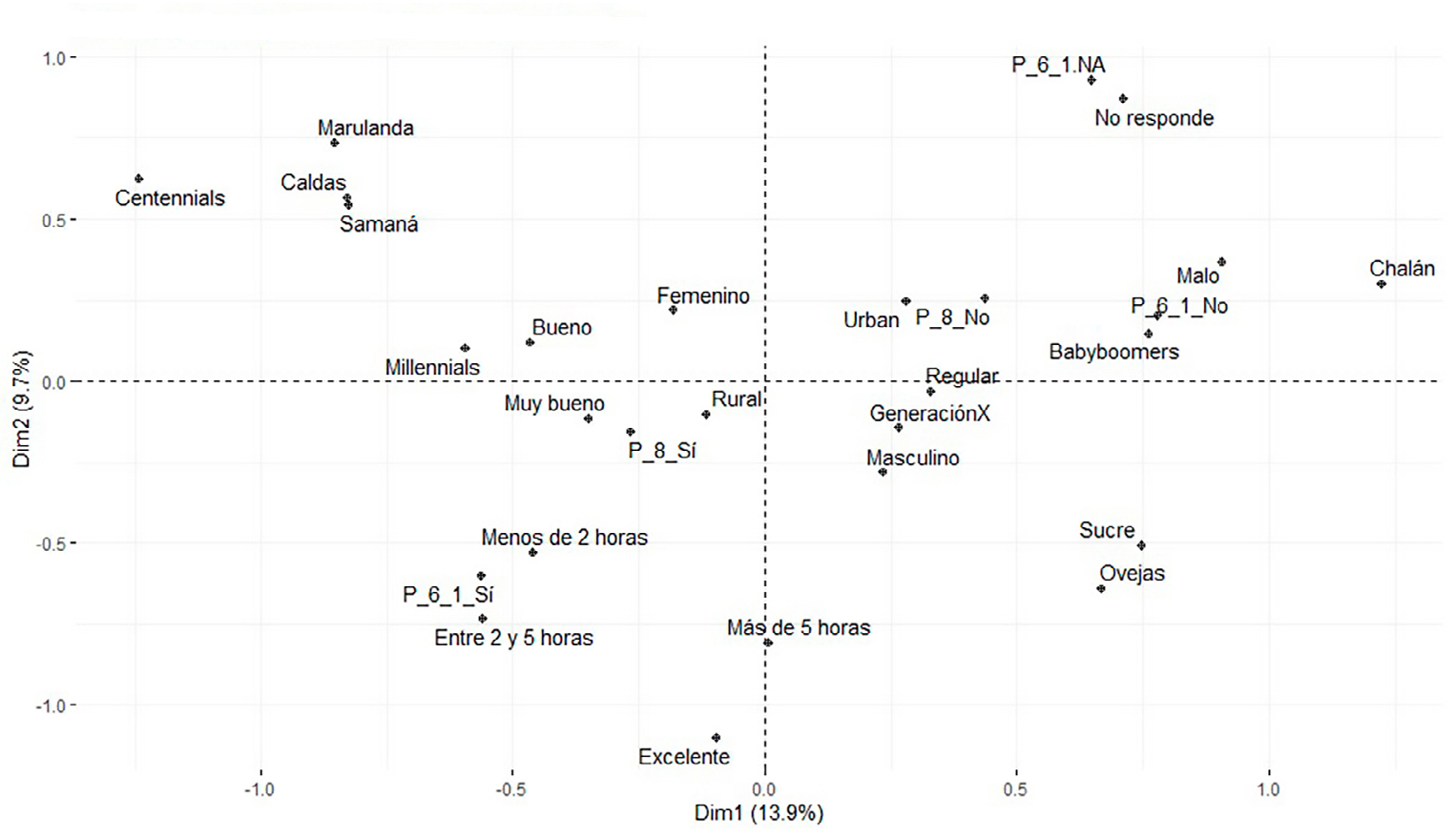Por otro lado, el mapa de factores basado en el análisis de correspondencias que se muestra en la Figura 6 permite vislumbrar nuevamente la relación entre Caldas y sus municipios con docentes más jóvenes, lo que concuerda con los enunciados de las preguntas. En línea con lo anterior, las agrupaciones para Sucre se visualizan de manera "opuesta" a las del departamento de Caldas, lo cual guarda consonancia con los hallazgos de Tondeur et al. (2018) y Umar y Yusoff (2014), quienes afirman que hay diferencias en la manera de emplear las TIC en los procesos de enseñanza y aprendizaje por parte del personal docente, de acuerdo con diversos grupos etarios, en lo correspondiente a la recolección de información, planeación, apropiación y evaluación.