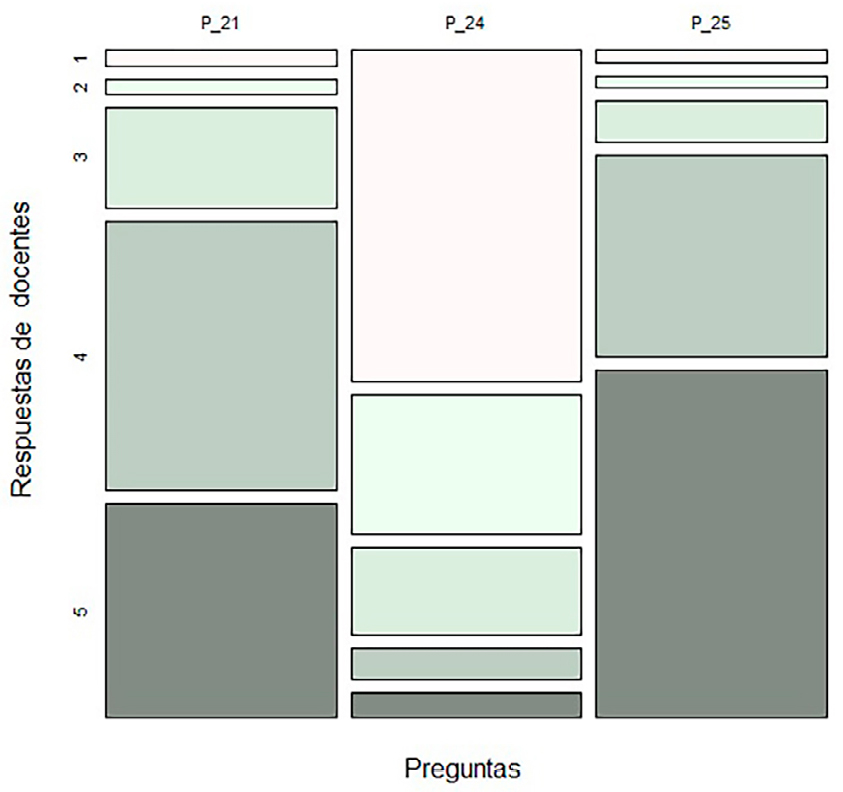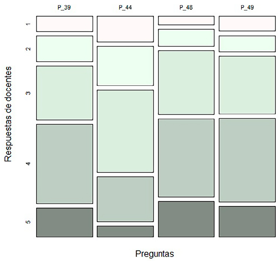 Para el análisis de correspondencias múltiples, también se emplearon las variables municipio, departamento, zona, sexo y generación. La Figura 3 muestra un mosaico que permite visualizar la proporción de profesores que dan respuestas, según su percepción en la escala propuesta, a las preguntas seleccionadas de este segmento.