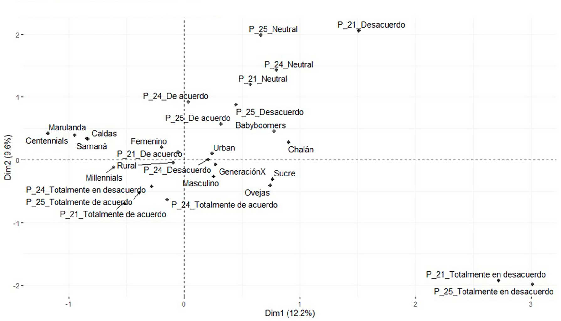 Según la inferencia realizada previamente, se estableció que el personal docente en Sucre es en promedio mayor a aquellos en Caldas. En consonancia con esto, se observa en el gráfico que los municipios de Marulanda y Samaná están cercanos entre sí y los milénials y centénials aparecen más vinculados a estas áreas, lo que sugiere una inclinación a respuestas de naturaleza más "juvenil" en las preguntas analizadas. En este sentido, las respuestas para las preguntas 21 y 25, que indican una calificación de "Totalmente de acuerdo", y para la pregunta 24, que muestra una calificación de "Totalmente en desacuerdo", se alinean con las categorías mencionadas anteriormente. Este segmento de docentes tiende a mostrar una apreciación positiva del uso de la tecnología, pues consideran que los dispositivos tecnológicos son útiles en el proceso de enseñanza y no perciben que dificulten el proceso.