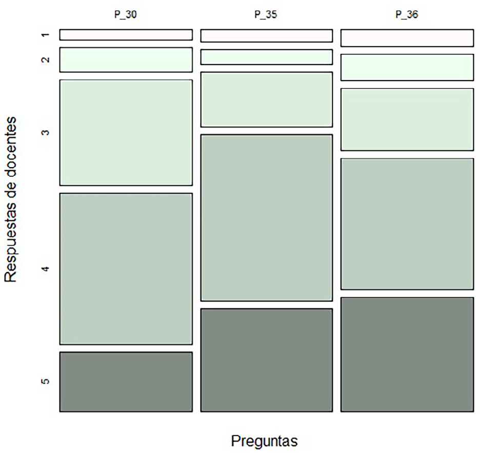 La Figura 7 muestra un mosaico que permite visualizar las proporciones del personal docente que da respuesta a las preguntas seleccionadas de este segmento.